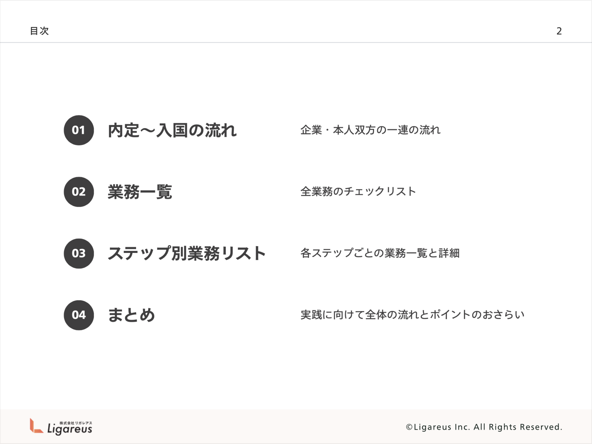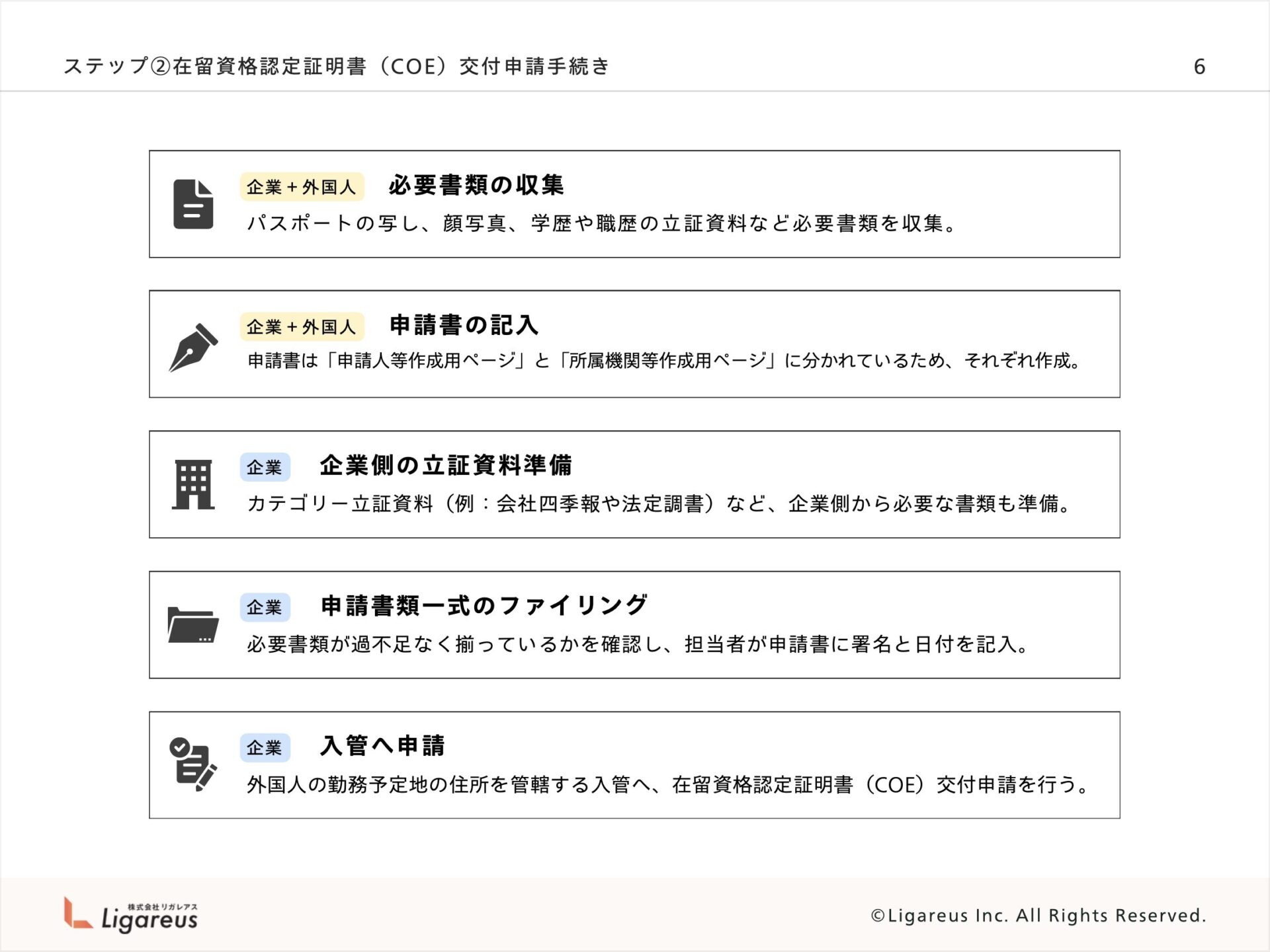 海外から外国人を新規雇用した際の、企業と採用者が行うべきビザ手続きをまとめた資料です。